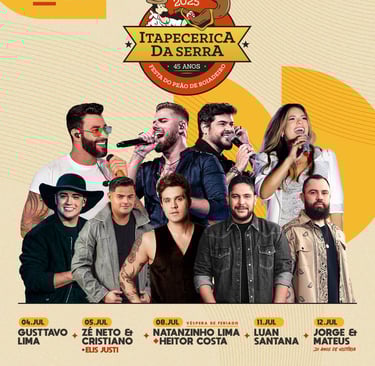 A festa começa no dia 04 de julho com o show do cantor Gusttavo Lima. No dia 05, quem sobe ao palco é a dupla Zé Neto & Cristiano e a cantora Elis Justi. O segundo final de semana tem a apresentação de Natanzinho Lima e Heitor Costa no dia 08 (véspera de feriado). No dia 11, é a vez do cantor Luan Santana realizar um grande show. E no dia 12 de julho, Jorge & Mateus apresentam a turnê "20 anos de história", encerrando o evento com grande estilo.
