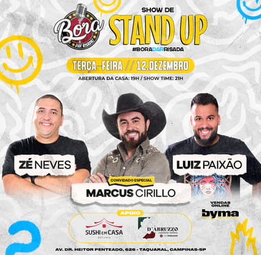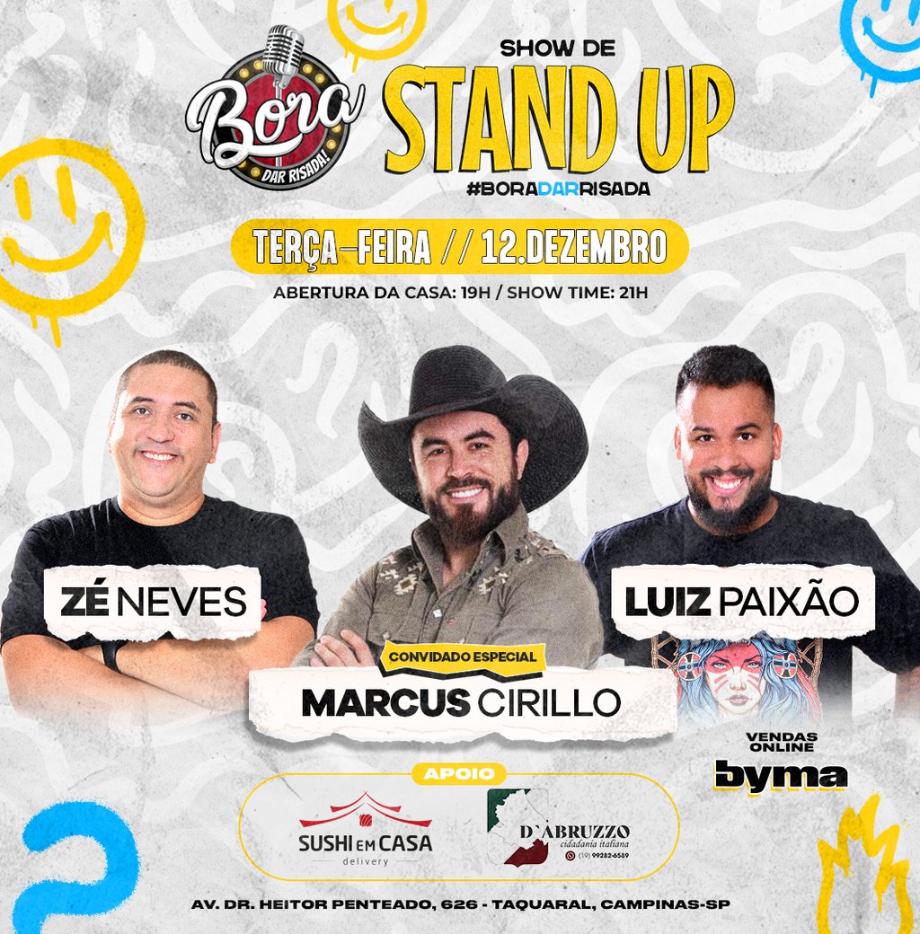Luiz Paixão e Zé Neves se apresentam no Bora Sport Bar & Café com a companhia de humoristas convidados, garantindo à plateia um show sempre diferente. Nesta terça-feira, o humorista Marcus Cirillo é o convidado. E, aí? Bora dar risada? Os ingressos podem ser adquiridos através do site Byma https://byma.com.br/event/6557b8f791a0f00008e0ecfe ou na bilheteria do local.
