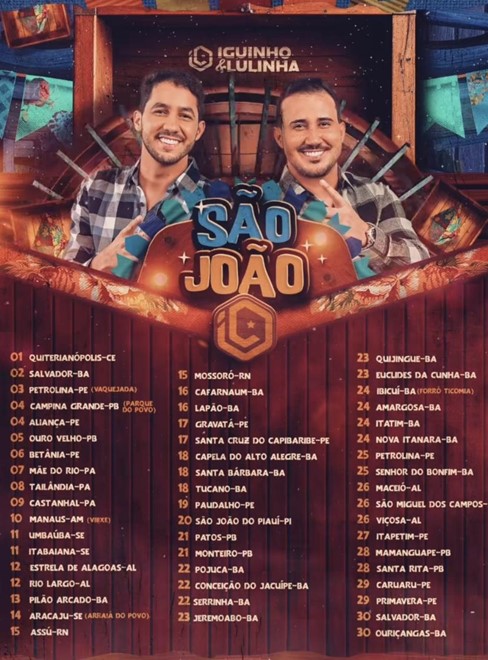 Considerados ilustres referências do forró, Iguinho e Lulinha mostraram, de forma grandiosa, seu poder e influência no mês de junho ao conquistarem a maior agenda de shows no período de São João. Ultrapassando grandes nomes como Tarcísio do Acordeon, João Gomes, Solange Almeida, Vitor Fernandes, Calcinha Preta, Limão com Mel e outras centenas de artistas, a dupla sergipana concluiu 52 shows por todo o país, começando por Quiterianópolis (CE), na quarta-feira (01), e finalizando em Ouriçangas (BA), na sexta-feira (30)