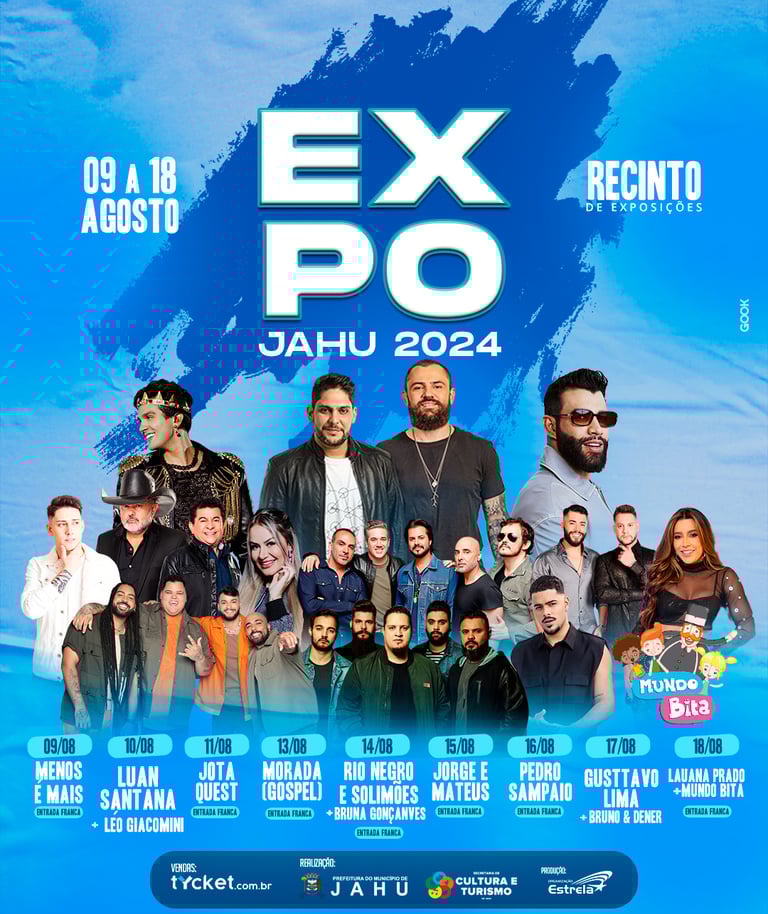 A Expojahu 2024 vai acontecer entre os dias 09 a 18 de agosto no Recinto de Exposições Sebastião de Camargo Penteado da cidade de Jaú, interior do Estado de São Paulo. Dos nove dias de festa, sete deles terão entrada gratuita para o público no setor "Pista" prestigiar os maiores e melhores shows da atualidade e os rodeios em cavalos e touros. Os ingressos podem ser adquiridos pelo site da Tycket https://www.tycket.com.br/expo-jahu-2024.html.
