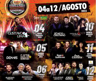 A abertura da 34ª edição da festa, dia 04 de agosto, a Brasa Burguers e Croissant & Cia apresentam o show do Embaixador Gusttavo Lima – considerado um dos maiores artistas brasileiros da atualidade, junto com a DJ Maju Santana. No dia 05 de agosto, é a vez de Dennis DJ e da dupla Clayton & Romário comandarem a galera presente. Para encerrar o primeiro final de semana, no dia 06 de agosto, Matogrosso & Mathias e Gustavo Mioto sobem ao palco.