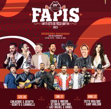 A FAPIS, que vai acontecer no tradicional Clube de Campo (Parque Turístico Municipal), terá entrada solidária todos os dias para o setor pista. Para garantir a entrada, basta levar até a bilheteria do evento ou nos pontos de troca divulgados nas redes sociais do evento, um quilo de alimento não perecível e trocar pelo ingresso. Os alimentos serão doados para o Fundo Social de Solidariedade do município e entidades assistenciais. O evento será realizado pela Chicão Shows, com o apoio da Prefeitura Municipal de Santa Rita do Passa Quatro, por meio do Departamento de Turismo, Cultura, Esporte e Lazer.
