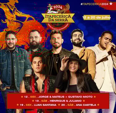 A festa vai começar no dia 12 de julho com o show da aclamada dupla Jorge & Mateus e do cantor Gustavo Mioto. No dia 13, quem sobe ao palco são os irmãos Henrique & Juliano que prometem um grande show. O segundo final de semana tem a apresentação do cantor Luan Santana no dia 19, e da "Boiadeira", Ana Castela, no dia 20. Nos próximos dias serão anunciados o link e os pontos de vendas para a compra de ingressos.