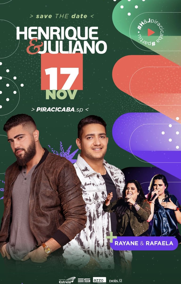 Uma das maiores duplas da atualidade da música sertaneja, Henrique & Juliano estarão se apresentando no dia 17 de novembro na cidade de Piracicaba, interior do Estado de São Paulo. O show vai acontecer na Unileste, local onde acontece a tradicional Festa do Peão de Boiadeiro de Piracicaba. No mesmo dia, também sobe ao palco a dupla Rayane & Rafaela. Os portões abrem às 19h. A realização do evento é da Organização Estrela, ES Agência de Eventos e da Azzo Produções.