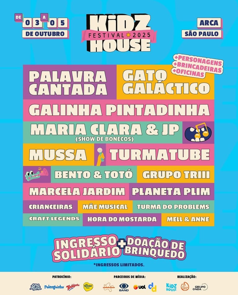 O maior festival infantil do Brasil chega à capital paulista com muitas novidades e, entre elas, o lançamento da modalidade de ingresso solidário. Depois de reunir mais de 15 mil pessoas em sua estreia, o Kidzhouse Festival, considerado o "Rock in Rio das crianças", retorna a São Paulo nos dias 3, 4 e 5 de outubro de 2025, na ARCA. Com a proposta de levar a magia do festival para além dos palcos, a iniciativa tem como objetivo arrecadar brinquedos para crianças carentes da cidade, estimulando a solidariedade e valorizando o direito de brincar como parte essencial da infância. Assim, quem doar 1 brinquedo em boas condições de uso poderá adquirir o ingresso unitário por apenas R$ 79,00. Os ingressos para curtir o festival estão disponíveis no site Ingresse.