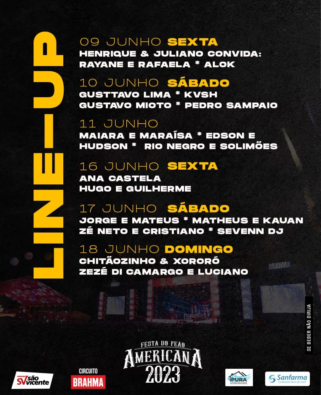 No dia 9 de junho, Americana dá as boas-vindas com Henrique e Juliano e a participação especial de Rayane e Rafaela. A noite encerra com o DJ Alok. No sábado, 10, o palco ficará sob o comando de Gusttavo Lima, Gustavo Mioto e dos DJs KVSH e Pedro Sampaio. Dia 11, no tradicional Domingo da Família São Vicente, os shows são de Maiara e Maraísa, Edson e Hudson e Rionegro e Solimões.