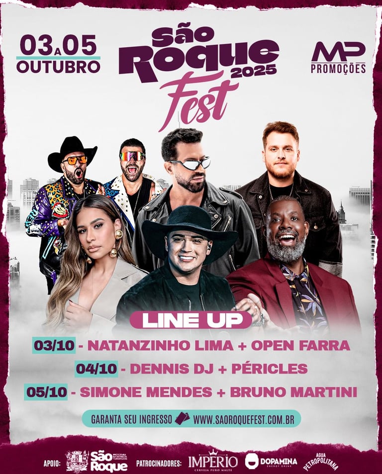 Mais informações e ingressos estão disponíveis no site www.saoroquefest.com.br. O evento é uma realização da MP Promoções, com apoio da Prefeitura Municipal de São Roque.