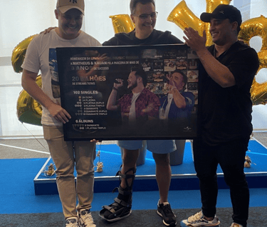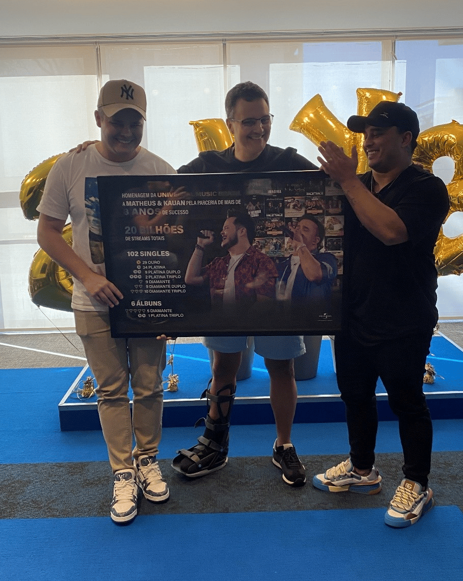 A dupla sertaneja Matheus & Kauan, originária de Itapuranga (GO), acaba de renovar o seu contrato com a Universal Music Brasil. Em um encontro realizado na sede da empresa, no Rio de Janeiro, os artistas foram recebidos por Paulo Lima, presidente da companhia; Alfridsman Muzzy, V.P Financeiro; Ana Bueno, diretora de marketing, Juliana Pontes, diretora de A&R; Ulisses Gasparini, diretor GTS e colaboradores. A comemoração foi ainda mais especial com a entrega de certificados de Diamante Duplo, Diamante, Platina Dupla, Platina e Ouro pelos 20 bilhões de streams combinados.