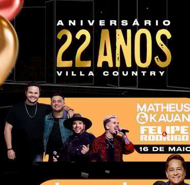 Show: Festa de Aniversário de 22 anos do Villa Country com shows de Matheus e Kauan, Felipe e Rodrigo, Leonardo, Matheus Vargas, Clayton & Romário e Bruno Rosa.